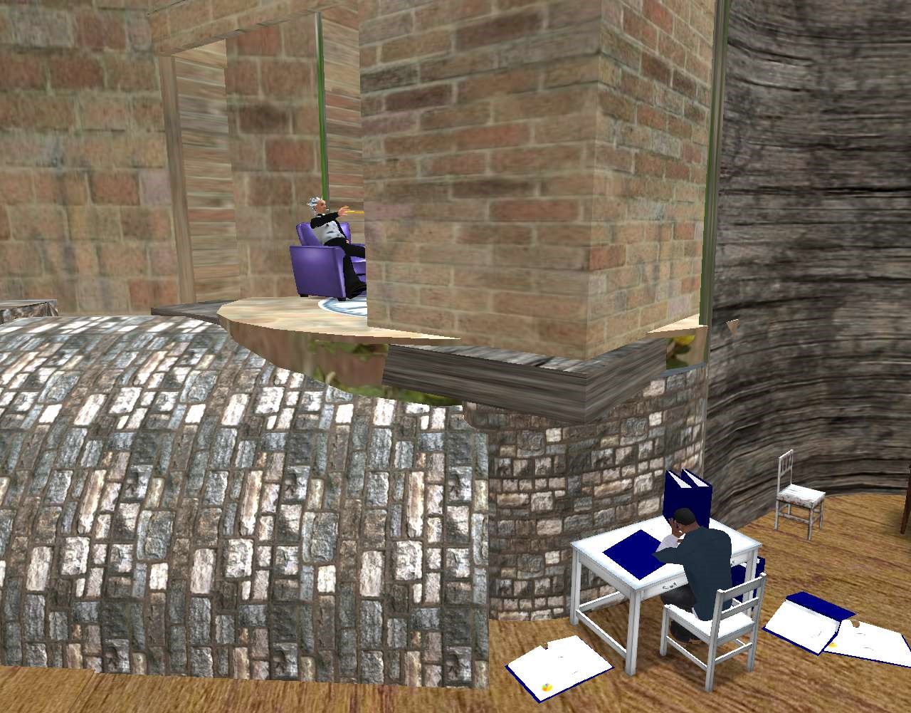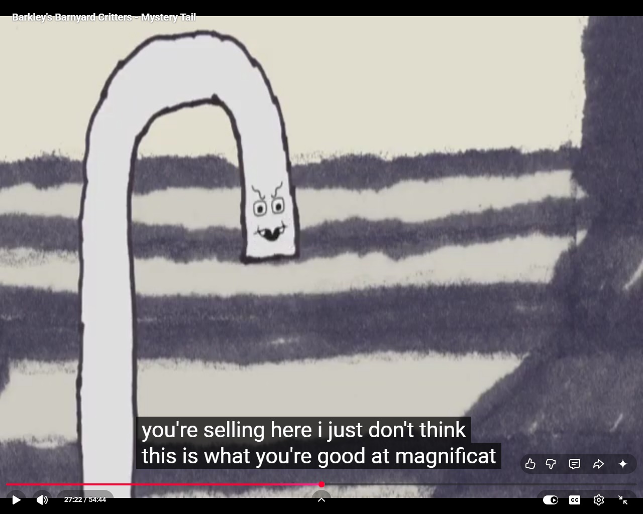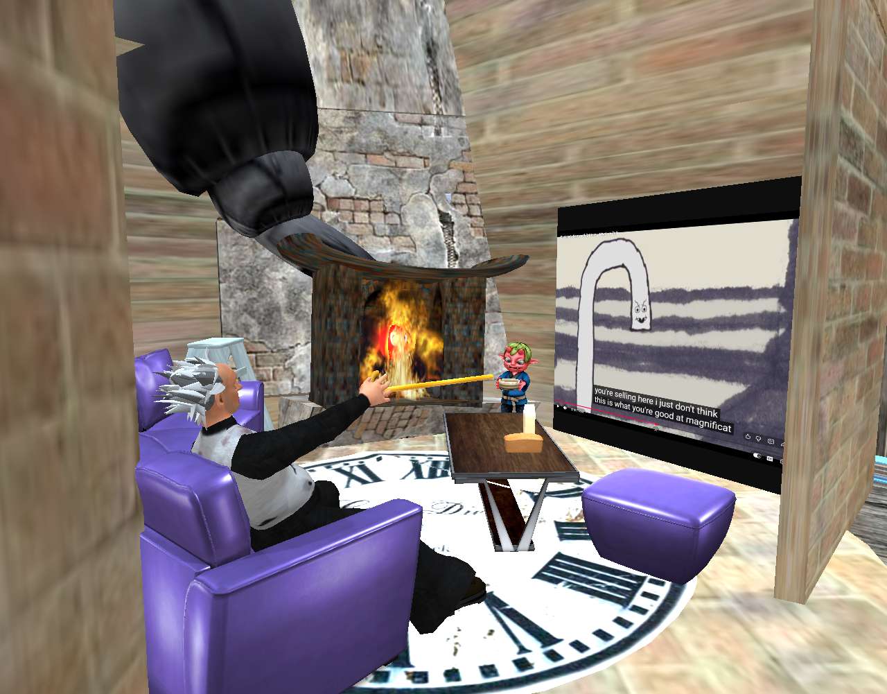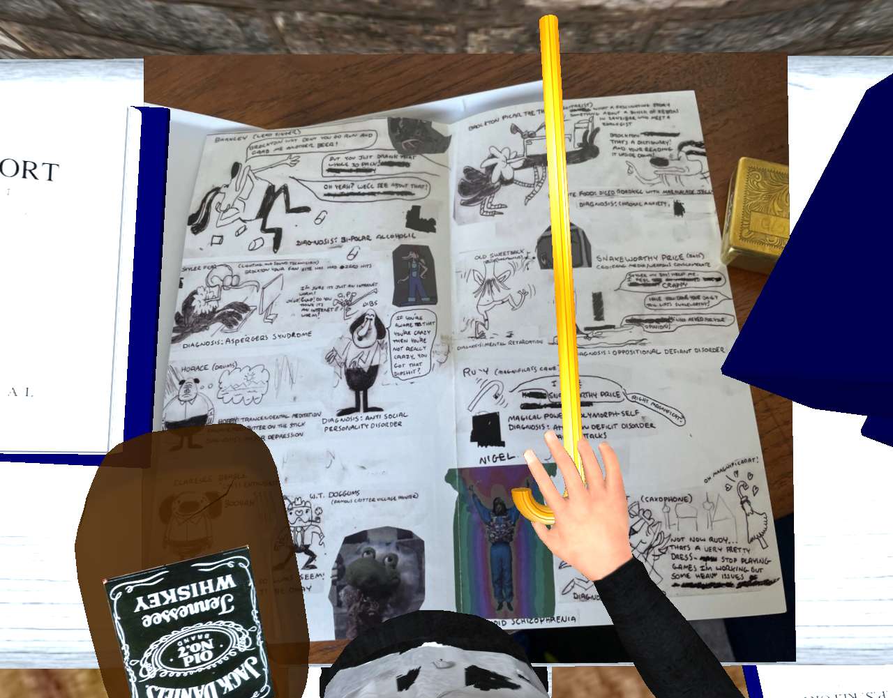 We downloaded an image of the liner notes from the source DVD this new cane appeared in the exact center of –Barkley’s Barnyard Critters Mystery Tail” — and put it on a prim for closer inspection. “There, *there*. That’s me (*SWIG*)!