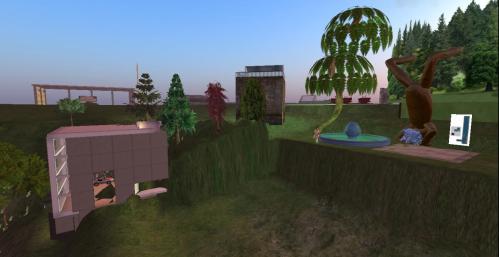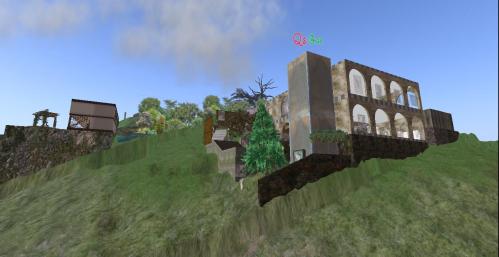 For the rebirth, we start on the western edge, where I revamped a small park containing a central pond and waterfall surrounded by small hillocks. Since creating this park about 2 years ago, someone — perhaps about a year ago I suppose — decided to insert a plain prim (“plywood”) block on basically the top of the waterfall, of about 10mx10mx20m dimensions. Ugly, obviously — ruined the effect. So although I couldn’t move or delete the thing, I decided to disguise it as a building, or the structure I’ve elsewhere called Home Orange, and used as my main office space in given locations. Unfortunately since the hidden prim is solid and not phantom, I can’t actually use the building. But it certainly looks better than before. Because the building looks kind of odd sitting on top of the waterfall, I also decided to add an obelisk to the tableau, and in the center of the fronting pool itself. This helps hide the rather incongruent juxtaposition of building and waterfall, I hope.