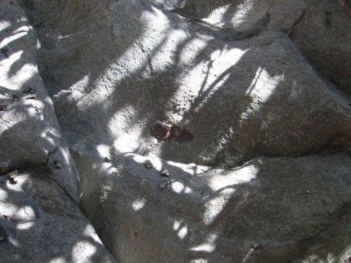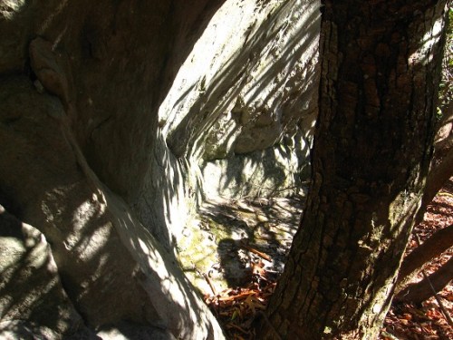 From the Weaving Place — which I might rename in light of the inability to actually weave the Bee Line here in any successful way — it was a fairly sharp descent through the open woods to the trail on the northern side of the mountain, also traversed this past weekend. Having failed with my weaving project just up the hill, my fantasy inclined attention instead focused on the queer rock art found all along about 800 feet of this trail, or what I now consider to be a true outsider art piece probably on pair with even Dongoba’s profound rock temples discovered in late 2011.