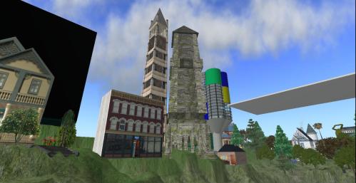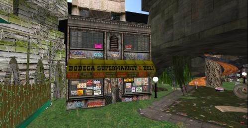 Also coming to Pietmond is Arcadia Asylum’s super nifty Bodega supermarket, packing a lot of entertainment into a trim 32 prim design. I’m not really sure why I’ve never used this structure before in Pietmond or anywhere else I can remember. Hmmm. Anyway, the market sits directly in front of the Tower of A. Mann, almost blocking the opening into this tower.