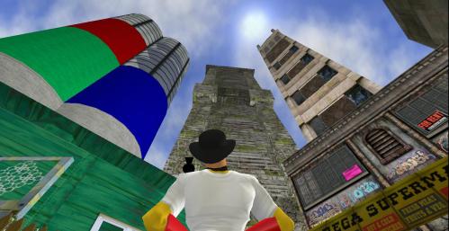 I’ve inserted two skyscrapers into the Pietmond landscape, one familar to fans of Pietmond and the other, higher one a brand new addition to the burg. The former is Big Boy Tower or just Big Boy, seen in Pietmond Phase II, and not that far from the new spot I set it up. My original post on this addition is here. Then I think I’ll call the new tower the Tower of Mann or Tower of A. Mann, sort of after rock singer Aimee Mann, who came up in a conversation between the wife and I recently, but of course is more a play off of the name Big Boy next door. The other tower is a big boy indeed, but this is a real *man* of a tower in contrast. I’ll have to measure the height asap but its looks to top the 100 meter mark quite easily. To put this is perspective, the Statue of Liberty is 93 meters high from the ground to Lady Liberty’s torch. And since that’s a statue of a towering woman and here in Pietmond we have Tower of A. Mann statue, perhaps they are more closely related in some as yet undiscovered way. Hafta think about that.