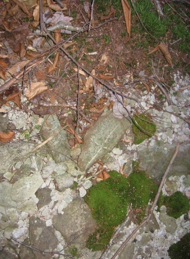 Here we have the central cairn of stones containing a number of interesting items, including 3 conjoined ribbons colored red, green and blue — actually more of a magenta, cyan, and indigo respectively in looking at the picture again (hard to tell the exact hue because of the shadows, though). These are the same type of ribbons that we find amongst the outer rocks.
