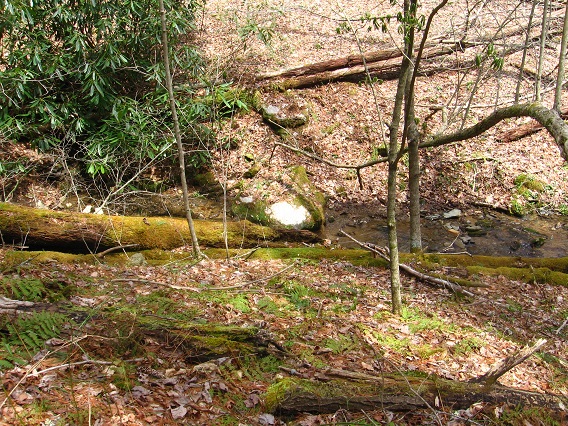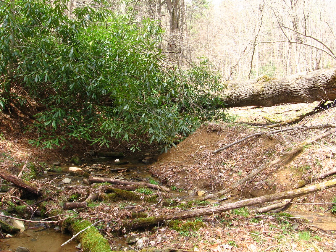 Big Log (name?) disappearing into rhododendron above Whitehead Brook. The higher creek bank before it may soon be topped with some kind of avatar “castle” or other structure. Just a vision.