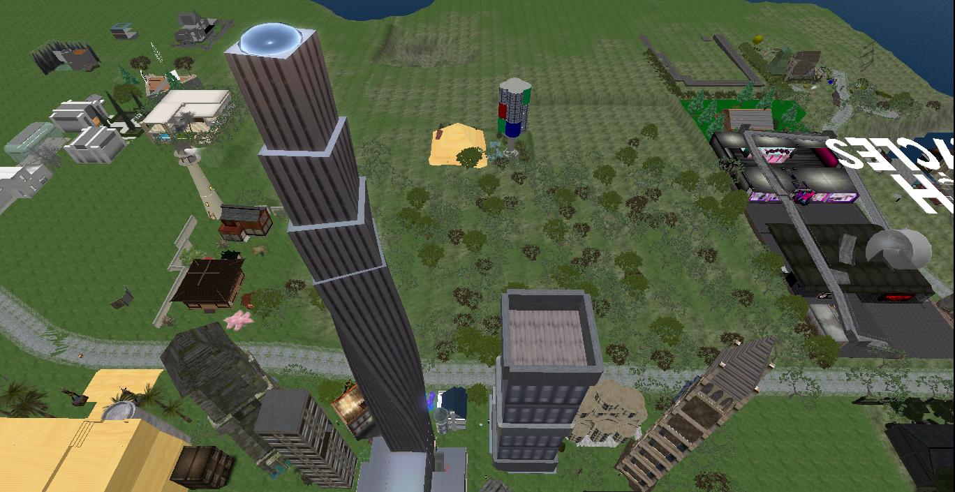 VWX Town has some advantages over my fall/winter New Pietmond project. Although the Power Tower existed in New Pietmond, Sikkima (its original rezzing spot), the Gilatona-Lis series was only about a third of the way over when I deleted the town there. Now Gilatona-Lis is completed, along with the attached Power Tower Gowlery itself; a new centerpiece of my virtual world. New Pietmond had several other skyscrapers, but the 2 tallest after the Power Tower contained basically nothing within. VWX Town seems more functional. Will guest artists return to my newest of virtual villages? We’ll see.