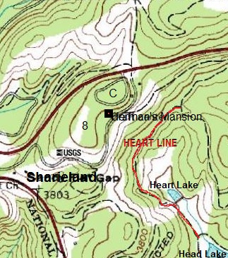 Heart Line is a path running from a postion between Heart and Head Lake to a road below Herman’s Mansion, cutting across the heart, as I interpret it, of his namesake park. I also assoc. it with the *Heart* Line on a *Hand*, positioned above the *Head* Line and whose lower end is just above the upper end of the *Health* Line. See the diagram at the end of this post.*