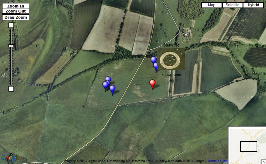 Also from 2001, and 2 weeks before the huge Milk Hill glyph appeared, comes this interesting formation that may be the closest ever to the Wansdyke. This would be in a field just west of the former Shaw village site.