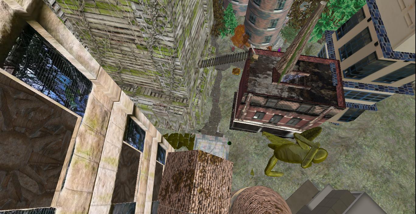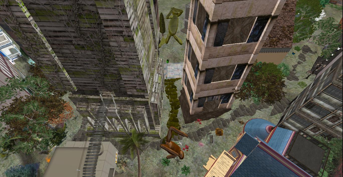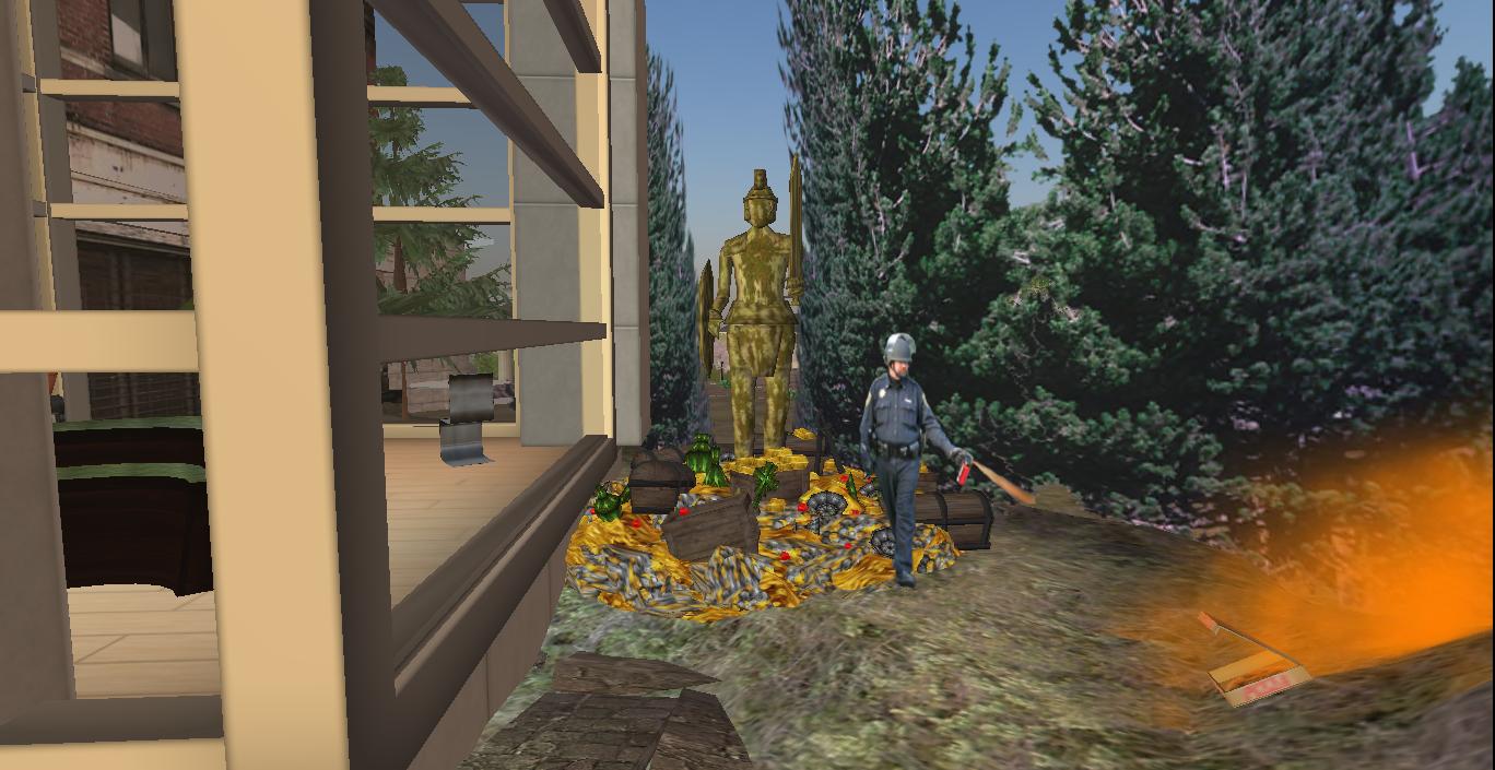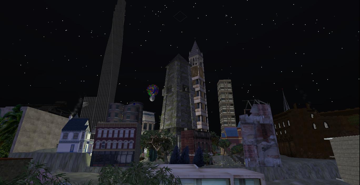 So here’s what I think is happening *now*. Central — Core of 4 or whoever — wanted *The Table* to become front and center, and cleared way for that by at least temporarily eliminating the ToXic Art Gallery and its bulk of the Art10x10 from the town. As of the last hour, it’s returned, but not where it was before. It has replaced the Hobo Squat that use to occupy the northeast corner of the burg, a logical progression looking back on it. The Goldie statue has also been moved to the end of a way that briefly became golden in color, but has, for the moment, turned back to its normal and lackluster gray — no golden roads in the village as of this writing (it could change in a moment’s notice). But Goldie is still there. And there isn’t just one Stairs Gallery building in town, but *two*, both surrounding the Big Boy tower.