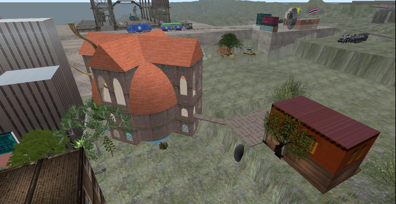 My neighbor’s tumblr site: Veyot’s View. She just opened up a pizza parlor (structure to right in above pic). Here’s an entry about VWX Town in particular — that’s Veyot with some of the town’s residents in the Church of The Diagonal.