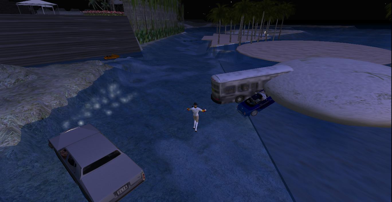 Actually it’s an AnneMarie Oleand “Bethillac Fleetwood V#1853” object, with additional description of “0, 66702, Route 1 Parking, 1”. Baker Bloch found it at the same location he saw conjoined, wheel spinning vehicles (school bus and trojan horse in that case) a couple of weeks before, at the northeast corner of Cosmet and basically on The Diagonal running across this sim.