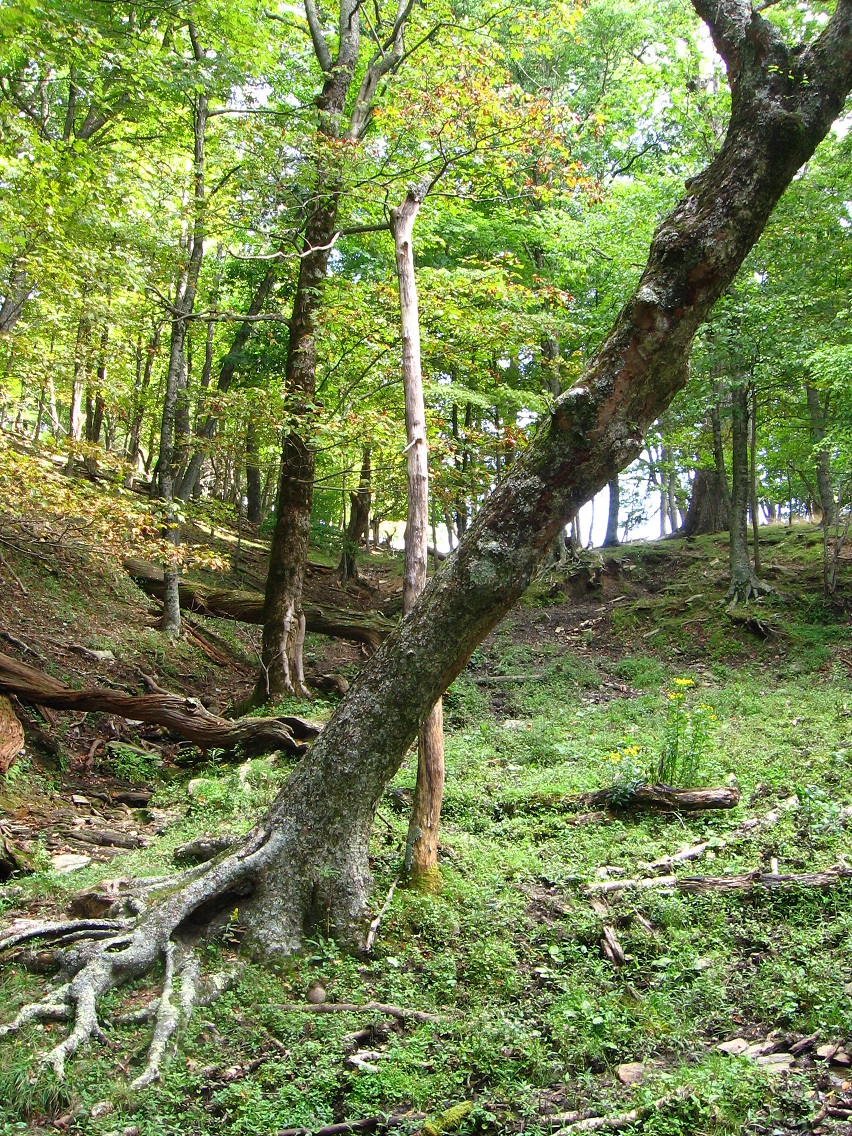 And these two conjoined trees, one live and one dead, also appear in the same photo to the right, perched directly above the stream head.