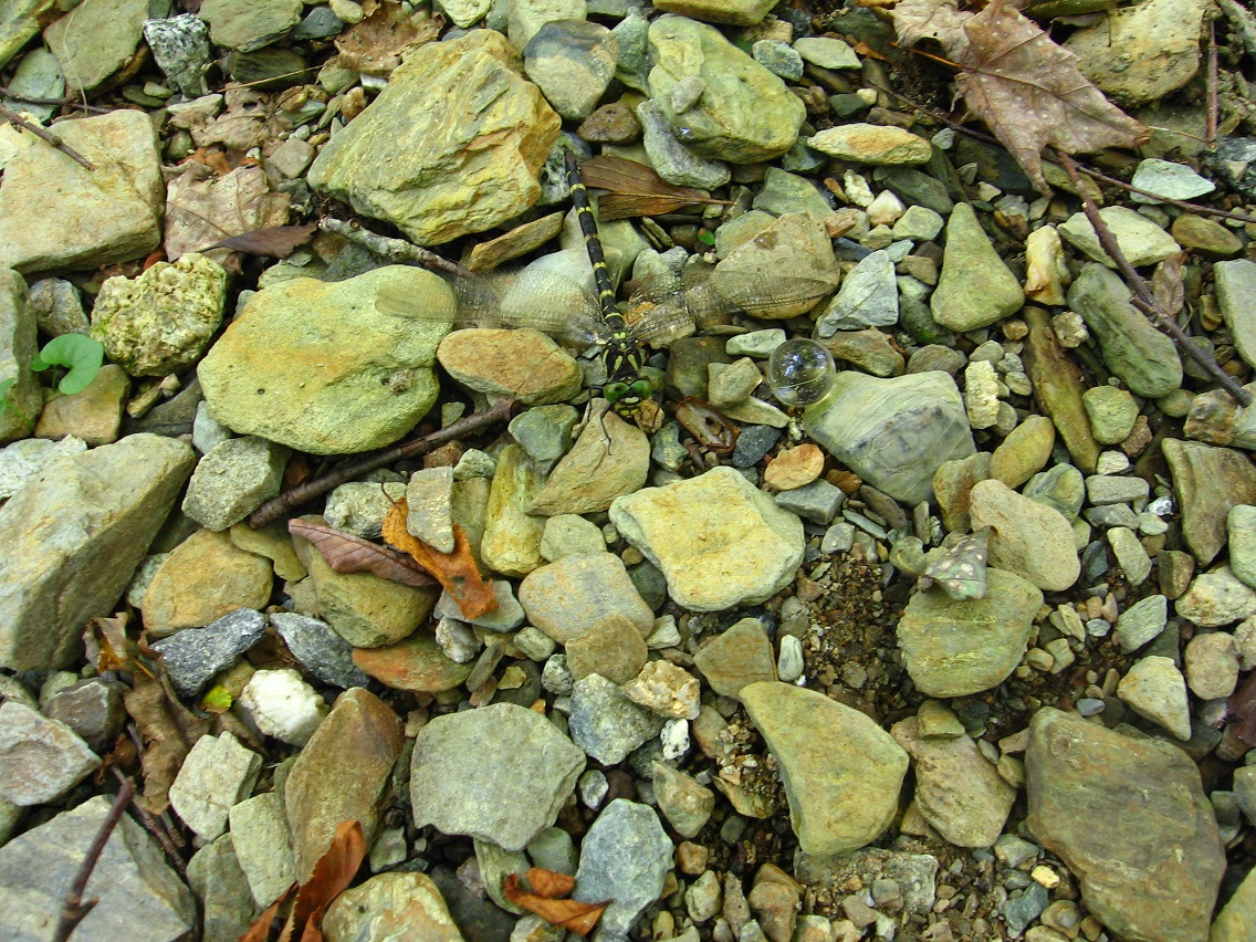 And then to punctuate the oddness, as it were, immediately after seeing the quite curious hole, I spied a dragonfly floating in the water near the tip of the beach’s projection. Thinking it was dead, I found a small stick and pulled it to shore. However, it started to stir slightly as I did this; it was obviously still alive, if weak. I managed to maneuver a leaf underneath it and then set it next to the dug hole. If the dragonfly were instead dead, I was planning to put it into the cup I left at the beach and take it home.