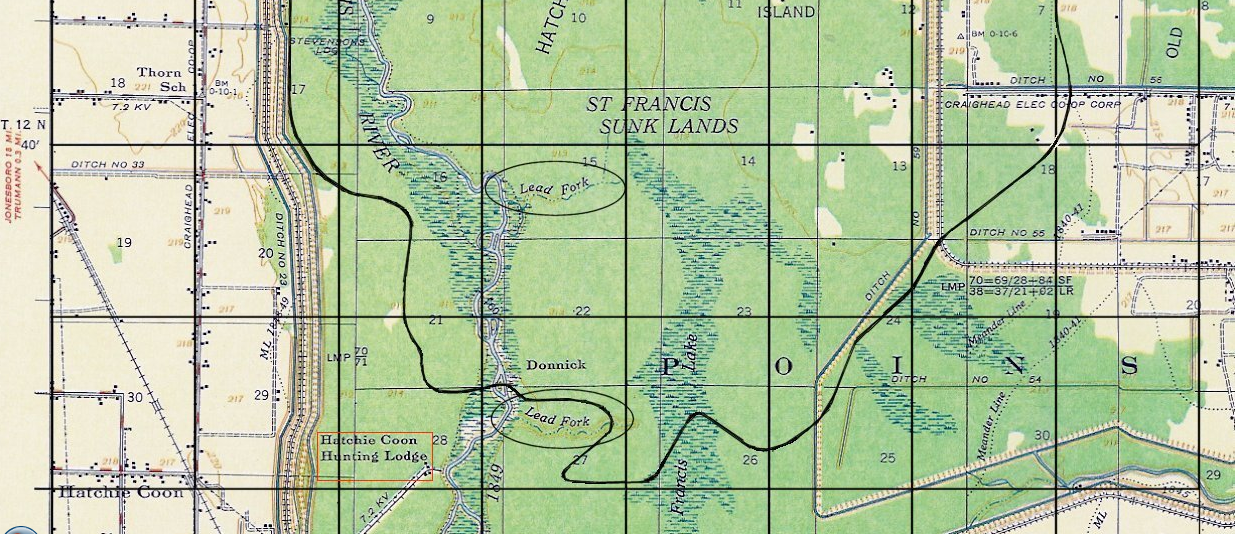 At the bottom of the section of the USGS topo map, shown just above, there is a ditch located along the inside edge of the eastern levee which borders the St. Francis sunk lands. The ditch is labled “Iron Mines Creek.” (This name is enclosed in a elongated vertical ellipse.) Anybody having knowledge as to whether there ever were iron mines in the St. Francis Lake area, and if so, where they were, please contact the page author. Also, on the St. Francis river, itself, near the former southern boundary of St. Francis Lake, are two annotations, “Lead Fork.” (These are enclosed in the shorter horizonatal ellipses.) If anybody knows what the meaning of these notations are, especially if the words “Lead” pertain to the metallic element bearing the same name, please contact page author. [See correspondent’s comments below.]