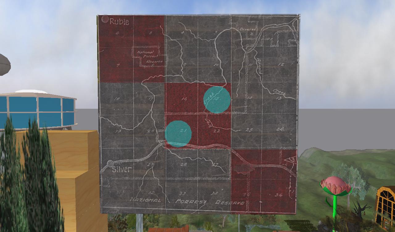 There’s the old front of the Temple of TILE in Rubi. This would be centered about where the Coolie Building stands now. It is a very telling front. In fact, this front is *still* in VWX Town — it’s inside the Tyle Cube revolving in front of the vacant Home Orange, Hucka D. Remember how Baker Blinker found it in ZicZac inside this cube and “unfolded” it? To me, in looking at it again, the red squares all stand for the Rubi sim that VWX Town takes up over a fourth of now. (no answer) That the 3 red squares lie on a diagonal, and resemble a game of tic tac toe, stands for *The* Diagonal that use to exclusively belong to Rubi until recently, when it was found to extend across the *whole* Heterocera continent. Exciting new Second Life development for this year fer sure. Hucka? Anyway, the fact that the rest of the squares on the map are Silver, and that Silver is the only other population place marked on this particular map…