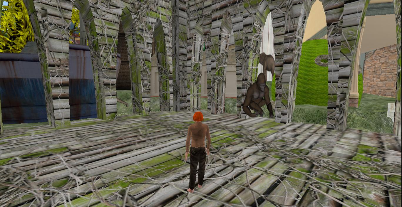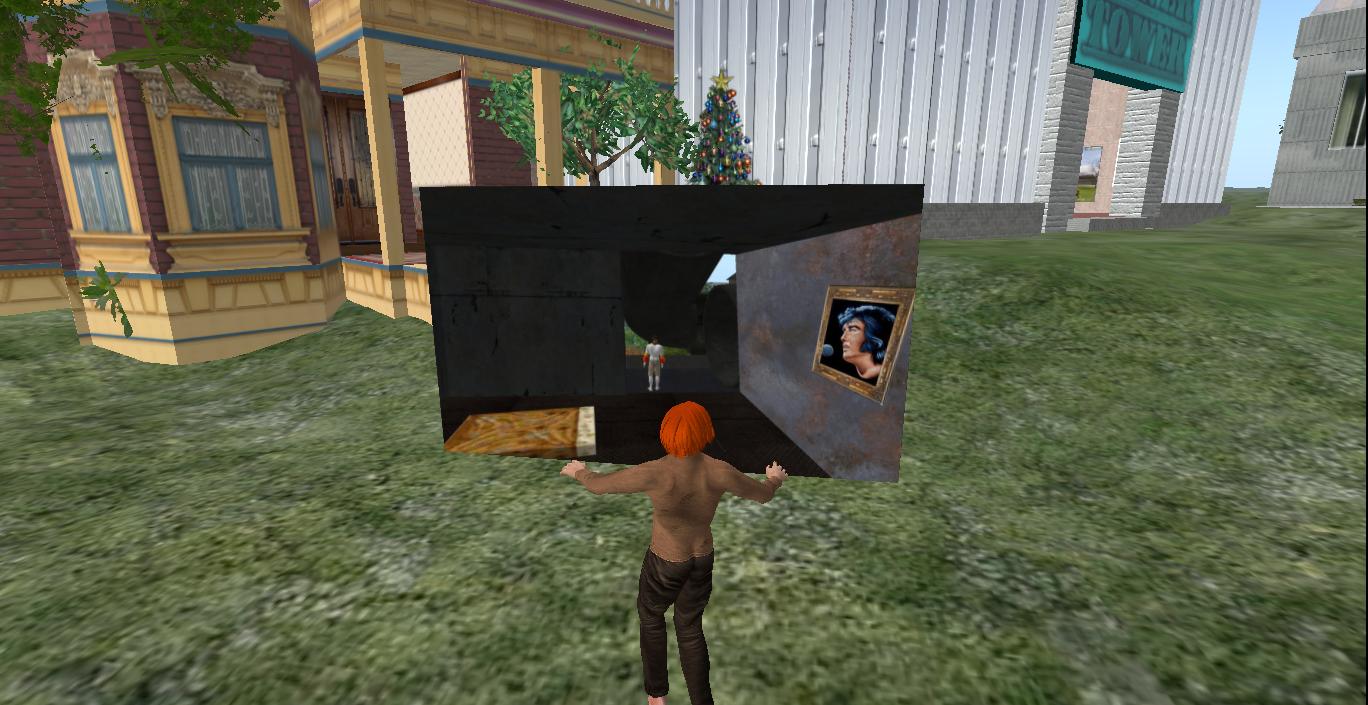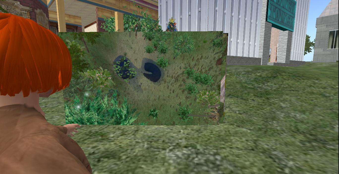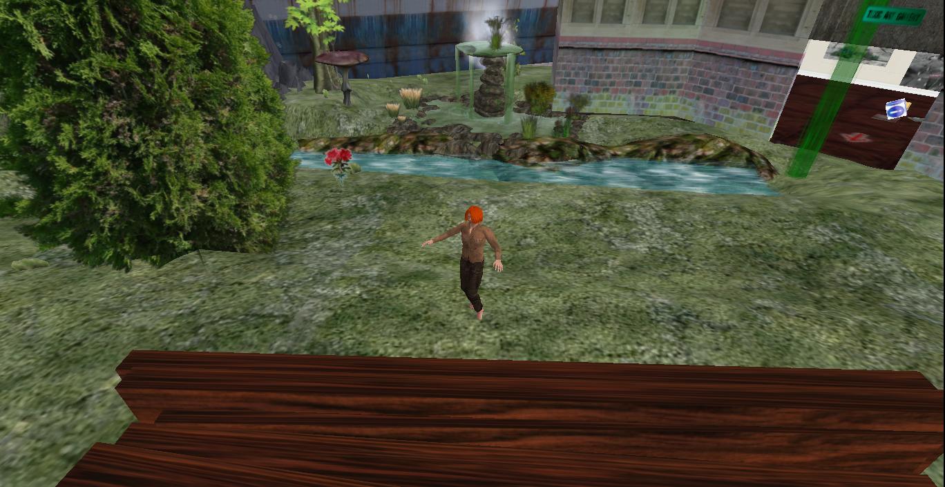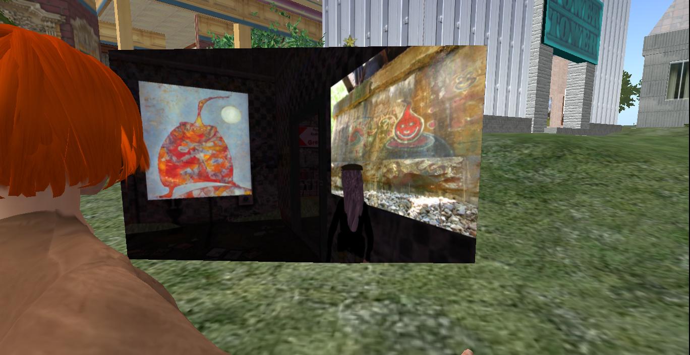 It was probably the next day that Edwardston woke up (in the Edwardston Gallery?) to find Carrcassonne at the pool with the Old Man Baby, or OMB as we’ll abbreviate it sometimes. Edwardston wouldn’t have known who Carrcassonnee was unless he had already visited the 3rd floor of the Temple of TILE, which is a possibility. However I happen to know that he hadn’t seen the massive green being before. Although Carrcassonne has the ability to speak, I also doubt if an exchange of words took place at this time. No, Edwardston would have just taken it all in in his silent, contemplative manner. Mulling it over later, he realized the similarity between Carrcassonne at the end of the new pool and the similarly colored yellow-green pod thingie at the far end of his stream — Edward’s Stream — running parallel to the length of this pool. He also knew that the Old Man Baby represented himself in many ways, starting with the similar red hair or red top, as he thought of it, like a carrot top again. He was newborn in this world, and so was Old Man Baby. Carrcassonne might have been a mother or mother figure to him as well; although they didn’t speak, perhaps Edwardston sensed she was sentient, and female (not apparent on the surface).