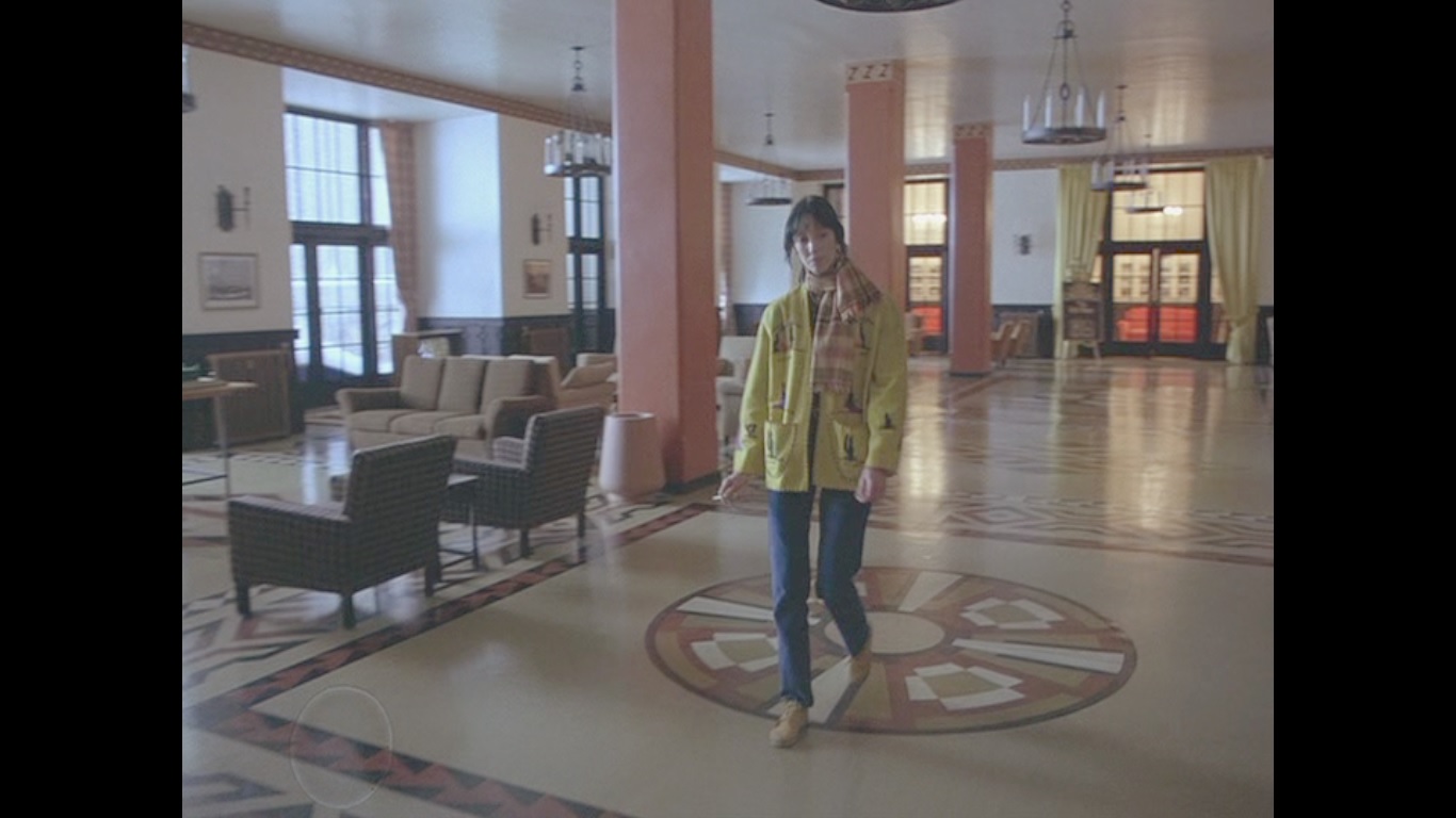 Juli Kearns is speaking of the 2nd still below, but in the frame before this we have a larger oval flaw appearing on the floor below and to the right of the strolling Wendy. Thought I’d include this here. I don’t have anything else to add to Kearns’ observations at this time except to reiterate that these flaws come just before the scene with the last “sha” sound of the movie (Wendy contacting the forest service via radio) and also, as Kearns noticed, right at the spot where Jack heard the *first* sha sound near the beginning of the movie, and also where he axed Halloran to death toward the end. I’m reminded of Halloran’s own words when talking to Danny about the shining gift: