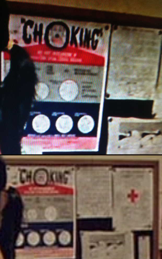 Notice the red car in the bathroom window (thinking of the yellow duck again), and the similarity with Kearns’ close up of the ChOking poster above, as she points out. I have not much doubt that Danny was choked during the “time” we see the 2 versions of this poster in the film. Danny has entered, or seems to have entered Room 237 just before this. But Jack seems to have an alibi since he’s been typing, or at least dreaming at his typewriter. We are confronted with another aspect of the maze.