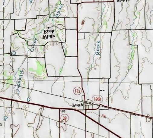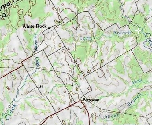 Another perhaps odd thing here: White Rock in Lamar County, unlike the great majority of population places on the topo map involved, is marked with a black dot. So is White Rock in Robertson County. If we make White Rock, Lamar County the retrograde inversion of White Rock, Robertson County merging these two black dots, we find that each lies about 2 1/2 miles from their Petty (Lamar County) and Petteway (Robertson County) and in the same direction.