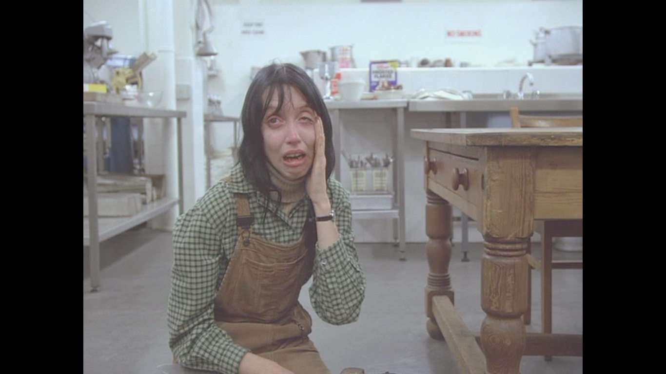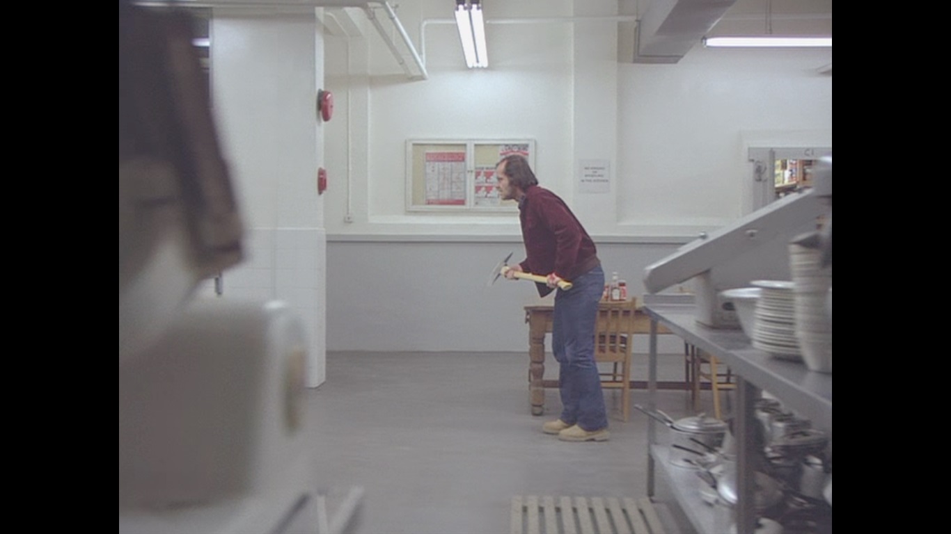 This is more obviously planned: Jack’s limping stagger through the kitchen when he’s searching for Danny (after pulling off the attack of Wendy when they hear Hallorann pull up in the sno-cat) is obviously suppose to line up with the chOking poster above his head here. He wears it as he would wear a crown.