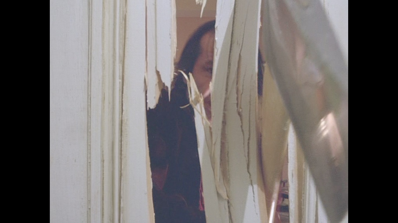 Jack breaks through the REDRUM bathroom door. I wonder what is reflected in his axe — hafta check this when I get a blu-ray player. At any rate, it certainly doesn’t look like the interior of the bathroom. Maybe this *is* just a type of continuity error? Kubrick couldn’t have planned *everything* in this film. But I kind of doubt it, given the focus Kubrick puts on this particular door, and the extreme camera angle here. He probably wants us to see something (again!).