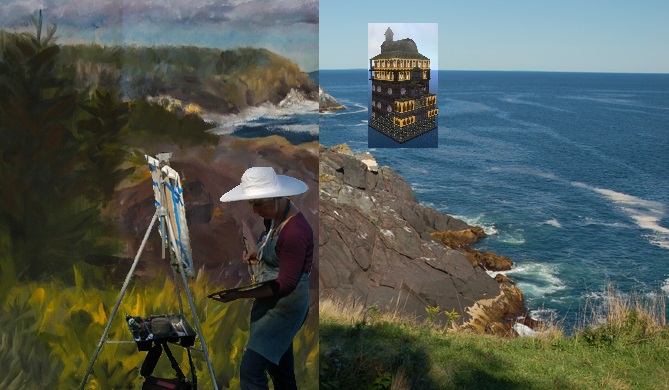 So the painter becomes part of the painting in the Falmouth collage before “2989”, and now she reappears in “2989”. The Green Man pulling off his head also stares at a duplicate canvas and easel.