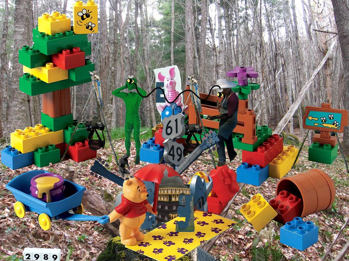 A town is constructed. Perhaps a virtual town or one that doesn’t damage the environment, or The Emerald, etc. Pooh and friends made it. Falmouth Castle or Gallery is at the Crossroads, perhaps perched on Orange Hill. Castle Dundee may be one and the same[ with it]. Falmouth Castle is in “2989” Pooh attempts to cover it with an umbrella, with only no to partial success. He stares at the Korean Channel “E”, the flip or schwa side. This is the side of Karoz, The Limited. Don’t you think Green Man in the collage could be Karoz, baker b.?