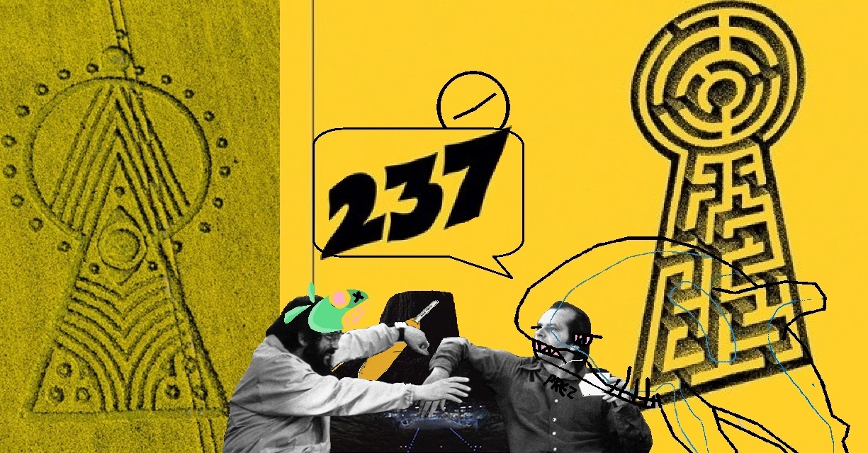 Dunno, Hucka D. (pause) Grapeshot is indicated by the tip of his foot. Let’s take a look at a larger version of the same crop circle, a crop circle that also plays an important role in “Baker Bloch in England”.