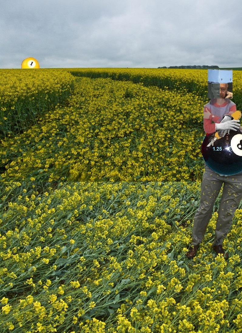 You have an animation based on Steptoe at the beginning. That’s new in itself. No true animation has been made of your collages before. Then toward the end you have another 4-part Avebury style collage, except set in Stonethwaite. And incorporating basically all the elements of the 2 Stonethwaite collages that come before this, both from the 10×10. Amazing, again. And in the collage above, which is an animation, you have the presence of TILE. You have red glow atop the 8 ball to the right, an [early 2010 crop circle in yellow rapeseed], a green being — the 4th member of Story Room actually — removing his head [standing on green algae of the lake/pond]. You’ve seen this entity before in Stonethwaite. Let’s return to him. Then the blue of both the “E” and mirrored Square Peanut complete the 4 TILE colors. Fantastic. You had to go out of Stonethwaite to see this.