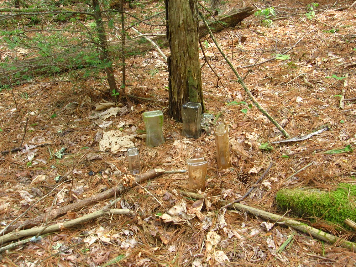 In the final version of “Rock, His Story”, we have both boxed and unboxed versions remaining, the unboxed version directly above the boxed version. The boxed version defines the limits of another Whitehead landscape photo added pretty early in the process, and this would be from the percieved center of the 4 Sticks region, not yet appearing in the Falmouth series. Specifically, it’s of 5 bottles set up at this center, the germ of a toy happening that hasn’t taken place yet. My idea is that more bottles from Hucka D.’s stash of 55 or so — also appearing a bit later in the collage at the bottom — would be used to enlarge the germ or seed process.