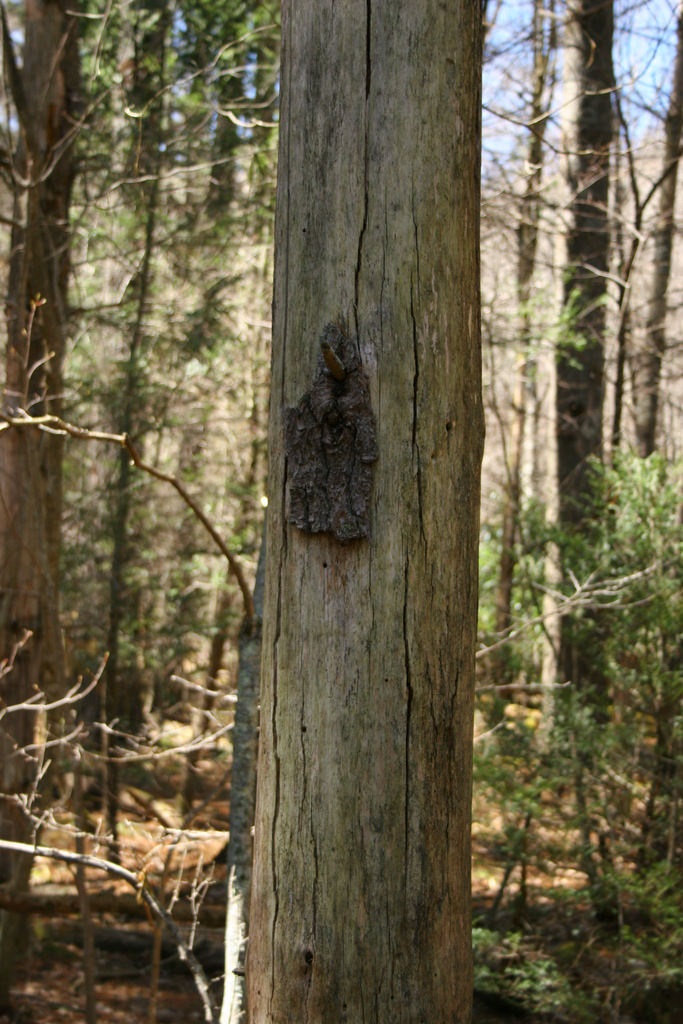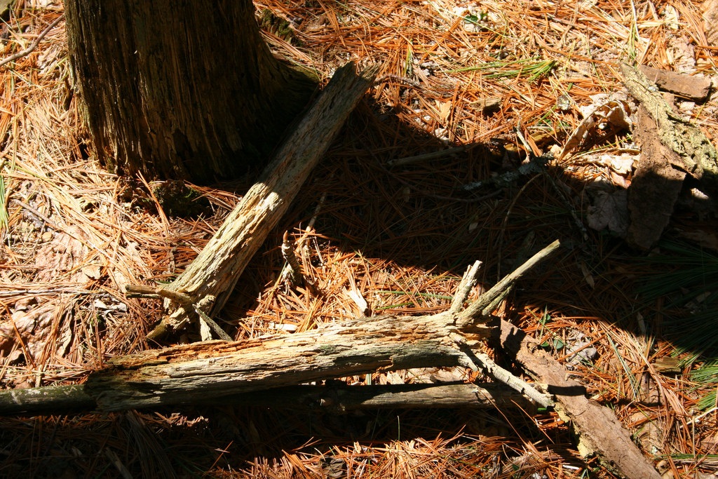 Center o’ 4 Sticks. The big psychic event of the day seemed to be the removal of the large stick that had been uncomfortably lodged on the back of a small tree since I remember. Instead we found it laying in two basically equal/symmetrical pieces on the needled forest floor below. Edna originally expressed doubt that this was a mystery. I quickly convinced her otherwise. You have to be aware here!
