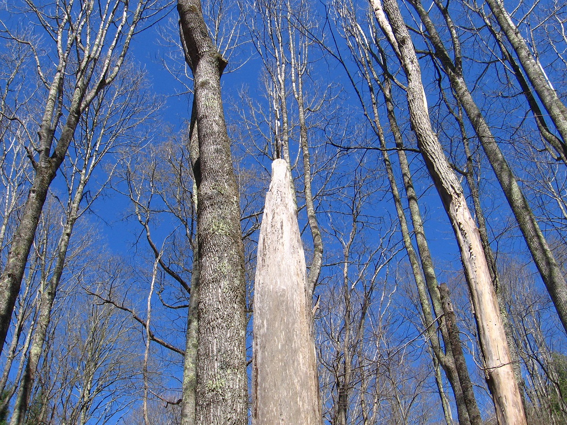 Looking up into the pines, with a large, long stick lodged against the most prominent one displayed here.