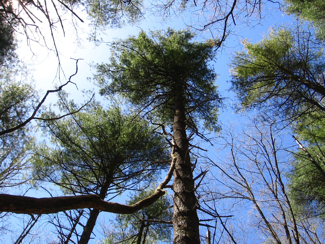 Looking up into the pines, with a large, long stick lodged against the most prominent one displayed here.
