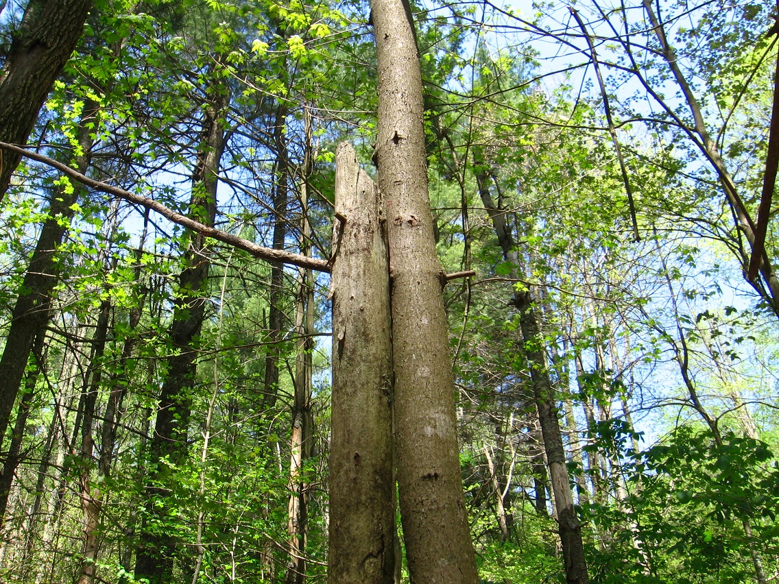 The below photo comes from the top of The Pendulum, where the supporting and supported branches are almost exactly the same circumference. The small twiglets projecting from the latter, holding up the former, are hidden from view here.