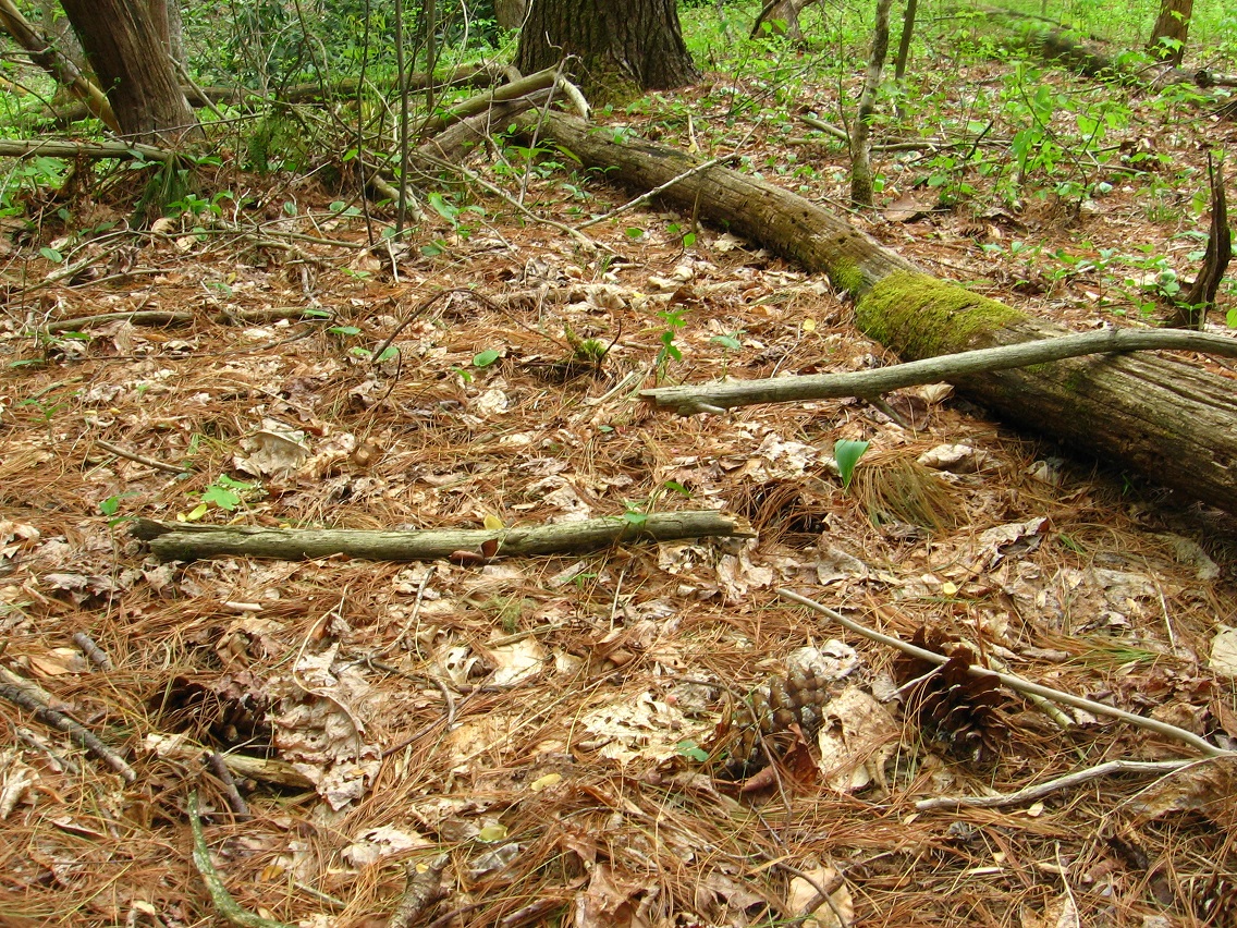 Peculiarly symmetrical stick laying on the forest floor nearby.