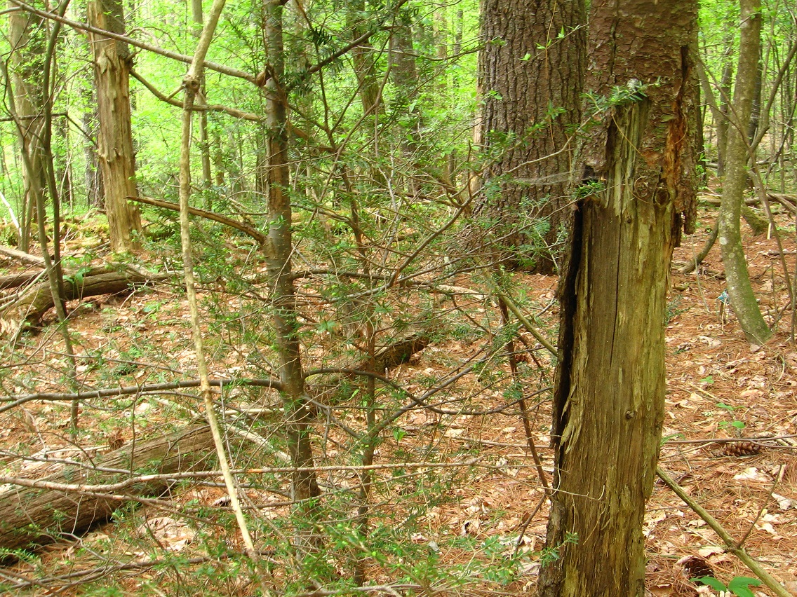 This is First Stick (pointing to First Tree), which has been doubled by another, similar sized fallen branch sometime during my 4 year interaction with Whitehead X-ing oddities. This makes a distinctive “V”.