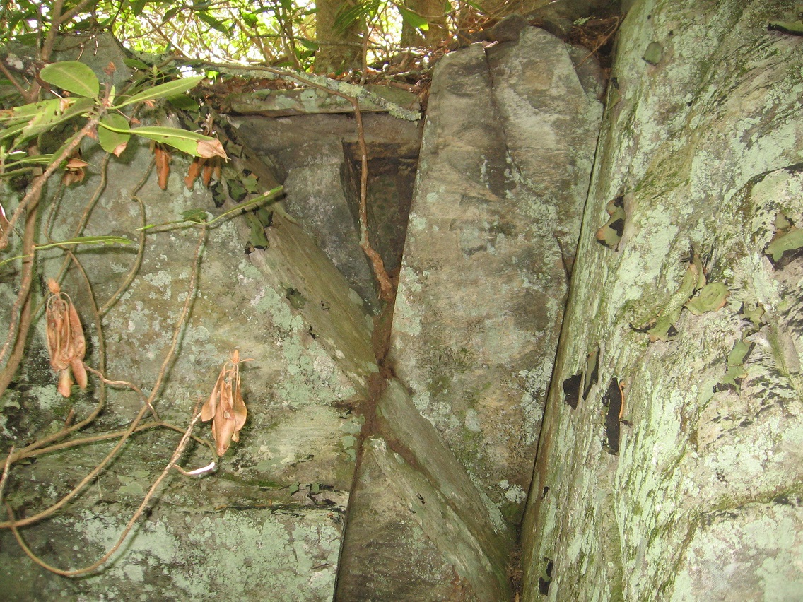 Here one of those amazing Crossing area finds: I emerged from the Woods of Howl on the north side of the ridge, following a faint but obvious path through upper part of these woods. Then the path continued downhill, *cut through a thicket of rhododendron*. It was obvious that someone put a lot of work into this path. But where did it lead? I had rough ideas when I headed downhill through it (still cautious of my wonky back, since I was suppose to avoid downhill walking when I was more in the early healing stages). On and on it went, chopped through rhodododedron, and still a path in pretty good shape although I can’t imagine who would use it.