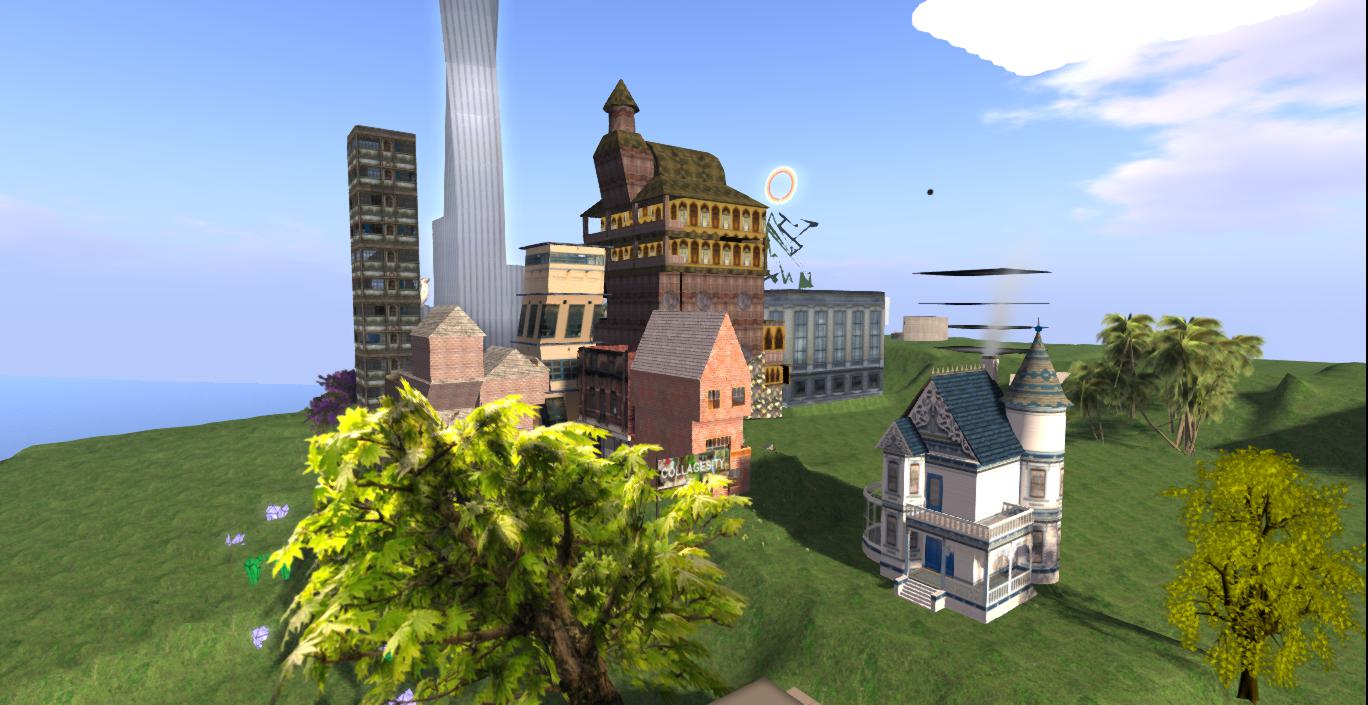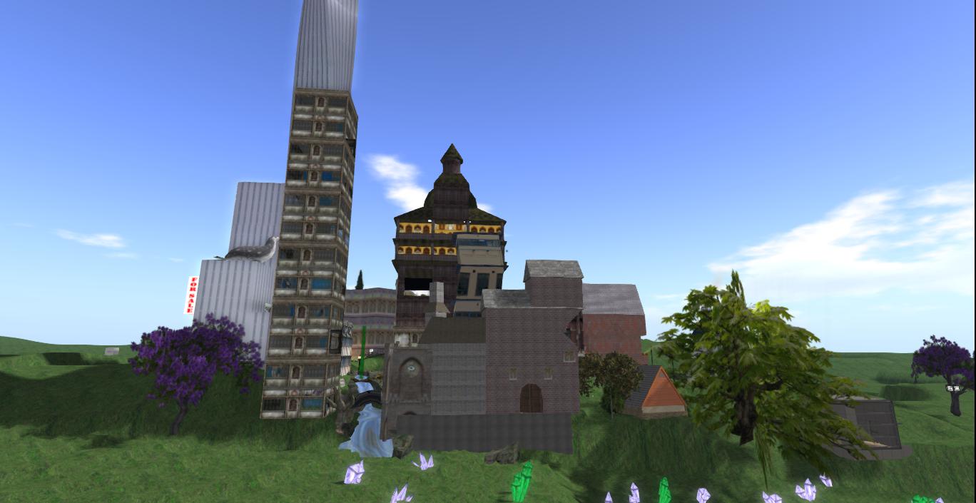 I should mention my Noru land purchases immediately after selling the Hector property. These include a 1024 and also a 512 along what was then the southwest part of my Noru holdings, giving me a nice 72×64 meter space to work with. Without these purchases I don’t think Collagesity could have flowered into what it has become and is still becoming. Fate. These purchases eventually allowed me to create a *middle* row of structures between a north and south row, and this seems to have made all the difference. And the design of this middle row is basically an import from Rubi’s VWX Town — another sharing — copying the lineup of Bodega Market-Coolie Building-Stairs Gallery east to west again. A quite direct comparison with VWX Town can now be formed: Orange House can be seen as a very shrunken down version of the Table House, for example. More on all that soon, perhaps. There are a lot of VWX Town structures that don’t exist in Collagesity. However, many of the ones that have been developed beyond a shell structure (empty state) have been resurrected. True, we have no Temple of TILE, no Blue Feather Gallery, no TILE Tower, no Sink Lair. Yet what we do have seems even more pertinent for present times: the Kidd Tower, the Noru Museum (which didn’t even appear in VWX Town), the Stairs Gallery, the Norum Gallery, and of course the 3 large galleries with my collages, Toxic Art, Power Tower, and Fal Mouth Moon. Those form the axis, with the recent collages of Fal Mouth Moon more front and center than the others. Like I said, collage is the focus in the brand new town. Collagesity.