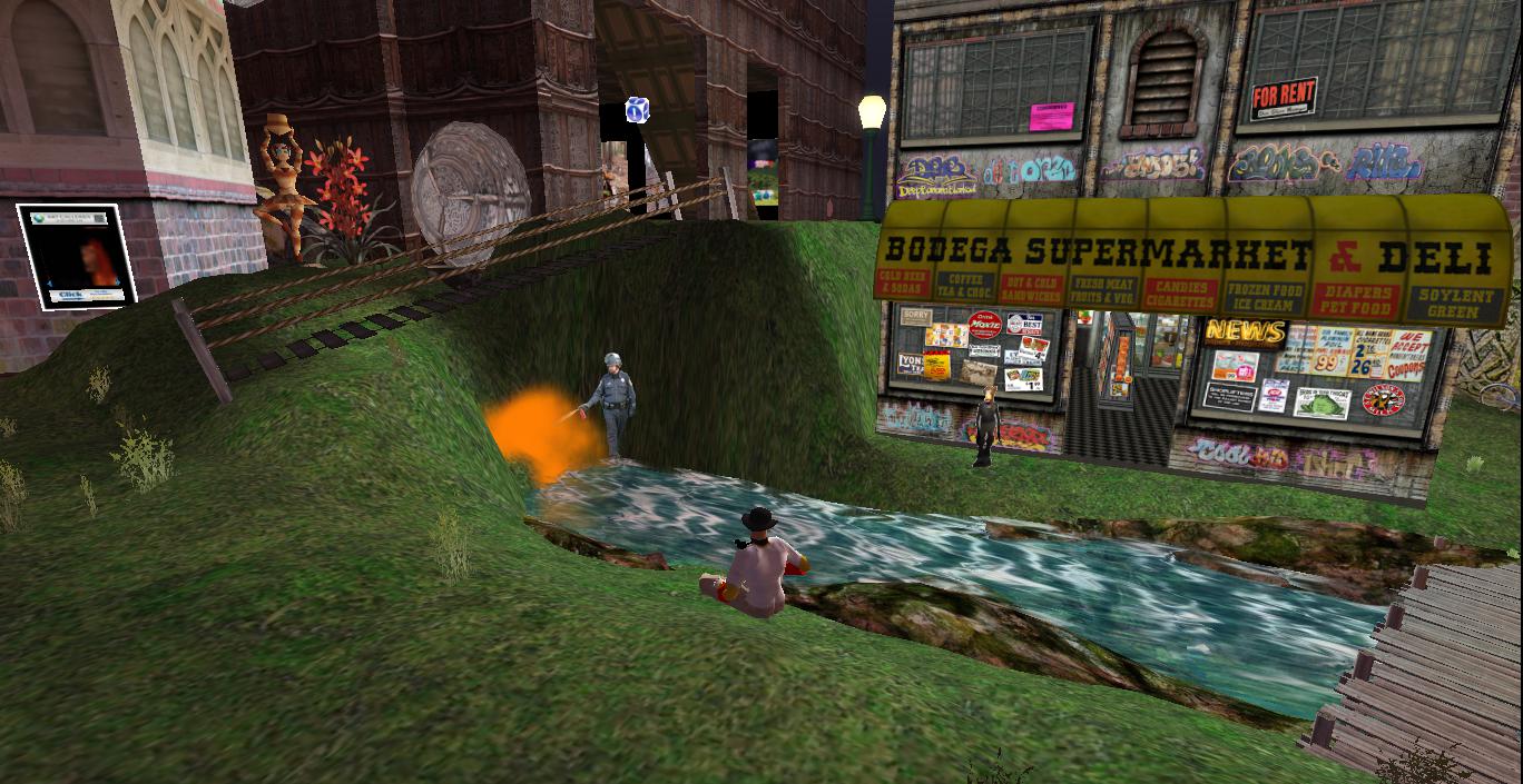 Below we have a picture of the center of town, a more open space surrounding its lone stream. Another comparison with VWX Town can be made here, since Collagesity’s stream is itself a *collage* or mashup of the several stream flows appearing in VWX Town. I’ll have more to say about that soon as well, I’m guessing.
