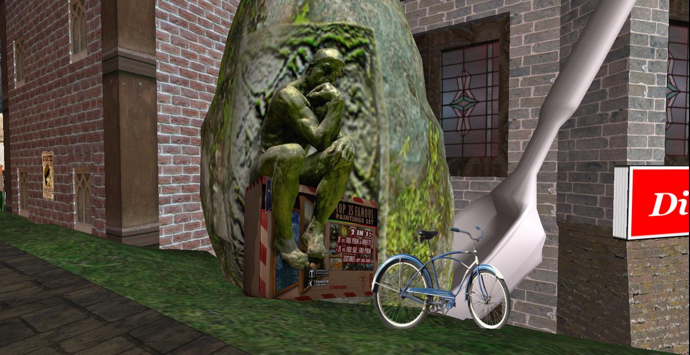 This is an essential duplicate of Tired Falls in Collagesity, sans tire. In fact, I believe the property’s owner, Oddprofessor Snoodle, yet another local with Chilbo attachments, might have copied this from my old neighborhood holdings originally, along with some of my other copyable objects at the time. I have bunches of ’em! I’ll have to provide a tour of Oddprofessor’s very interesting, physics oriented science museum in Mujagae sometime now I’m back in the hood. And, as I’m rechecking just now, O. Snoodle also owns the Sentinel sculpture pictured above.