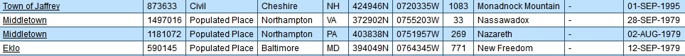 Middletown, PA and Middletown, VA show up next to each other in both an alphabetical county sort and topo map sort for that population place name. Total number of Middletowns involved: 81. Perhaps peculiar given the frequency, then.