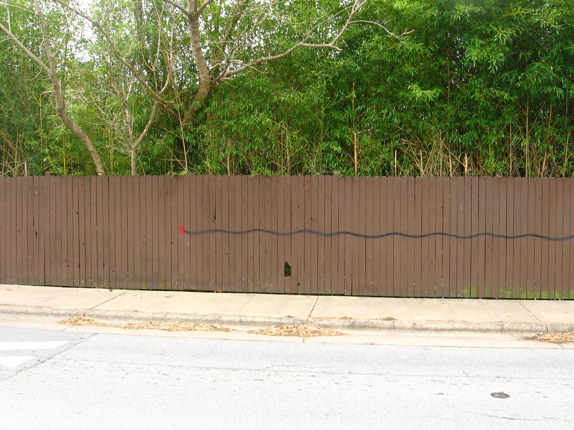 A perhaps peculiar design has been painted on the fence. Is is a map of the stream existing not far behind it. Do the joined red spots to the left indicate a mouth for the stream creature? Do the 2 dots indicate 2 different choices that the name of the combined stream could take, even? Things to be asking.