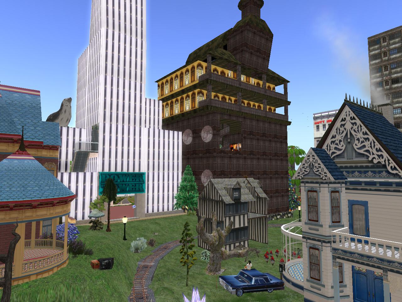 This may be *it* — my final Second Life move. I’m very, very pleased with the outcome of the admittedly quite sudden uprooting. It helped a heck of a lot that I abandoned my Noru land and thus was able to gradually move a lot of the components over to Minoa before their derezzing (which still hasn’t happened in bulk). Although the Power Tower and Falmouth galleries were set up there as well, Hector never developed into a true town, like Collagesity in Noru did. Minoa successfully continues this incorporation. Another plus is the close proximity of the already established TILE Tower still in Rubi, along with a small bar there. Funtastic.