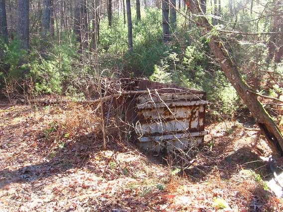 Another nearby structure. Looks like a large trash container, perhaps, now empty and rusting.