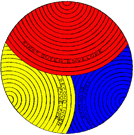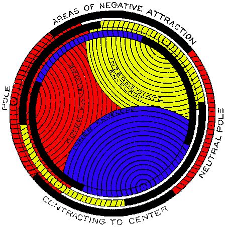 8.5 – Dynaspheric Shells – This faster vortex will be the inner most envelope which will be enclosed by the second spinning vortex and the third vortex will enclose the first two. Imagine an orange with three peels each one covering a band or width of the equator sealing the area not covered by another enclosed band. The poles of each spinning equator will be open. In Figure 26 the black areas of each shell are the spinning sealing areas of motion. The colored areas are the open polar zones. The three concentric peels will effectively seal the entire surface area of the orange according to its velocity of rotation which translates directly into force of compression and density. The end result is a highly compressed “solid” sphere of matter. These dynaspheric shells correspond to Russell’s “caps” that seal and hold an atom together. See “Atomic Suicide?” for more details.
