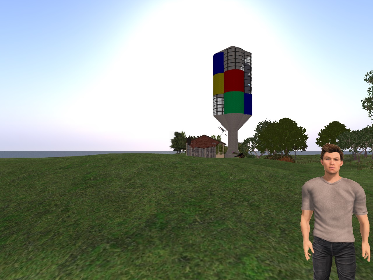 But prims needed to be pruned elsewhere. I decided that the Stair Gallery structure had to go. I replaced it with a nice 2 prim urban building. So that’s eliminated as a gallery space. But Collagesity has a Moon! And that’s perhaps about all the building I can do in the town. All’s that’s left is filling in the gallery spaces, it seems.