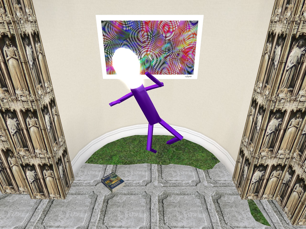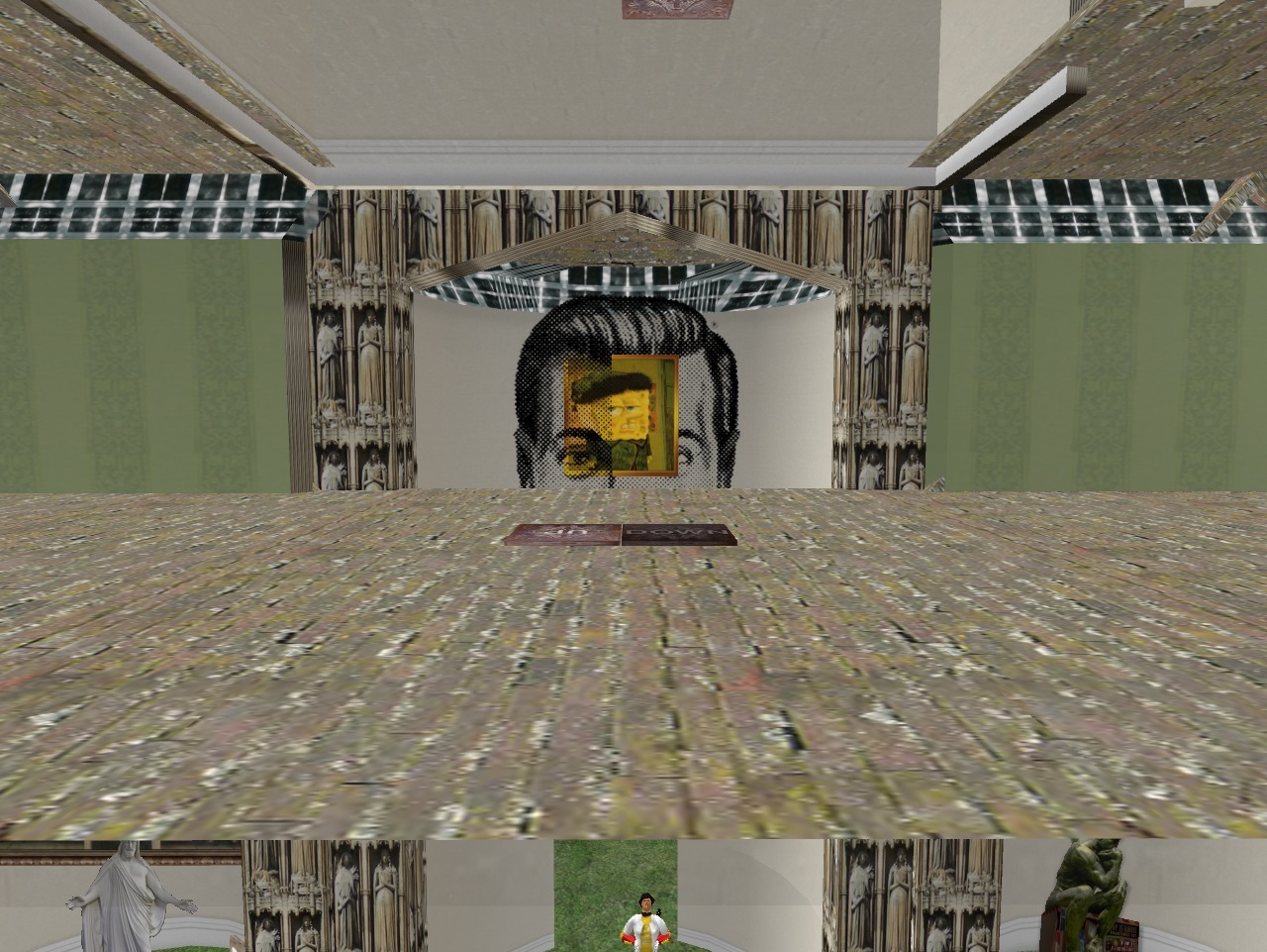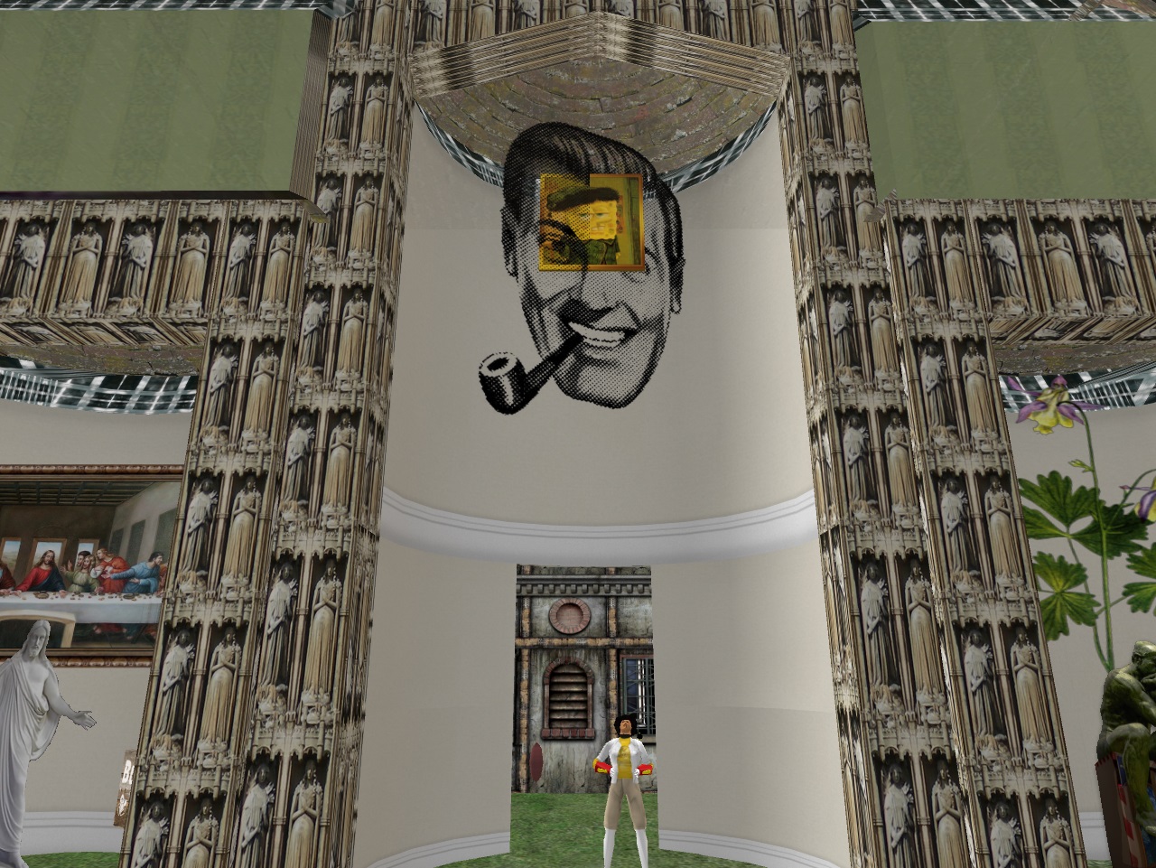 Then on the short axis of the temple across from Carrcassonnee twirls the Giant Head of Bob Dobbs, another popular religious figure like Jesus. Within his skull lies a stylized painting of Spongebob Squarepants: 2 Bobs in 1.