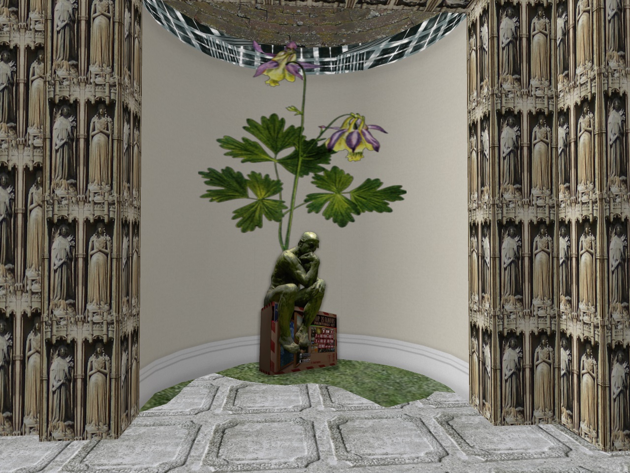 Across from them is Rodin’s The Thinker, with a large flower growing behind him.