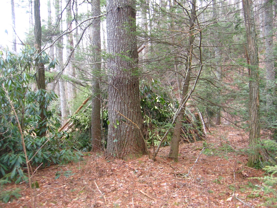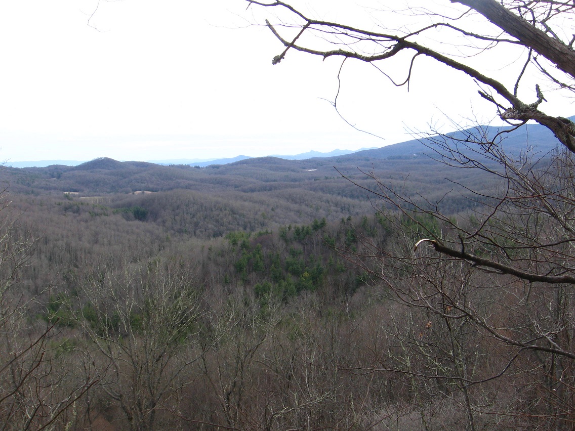 A view toward the Woods of Howl from near the top of Allen Knob. Very beautiful with its pines. You can just make out the shimmering surface of Frank Lake in the back center of the photo.