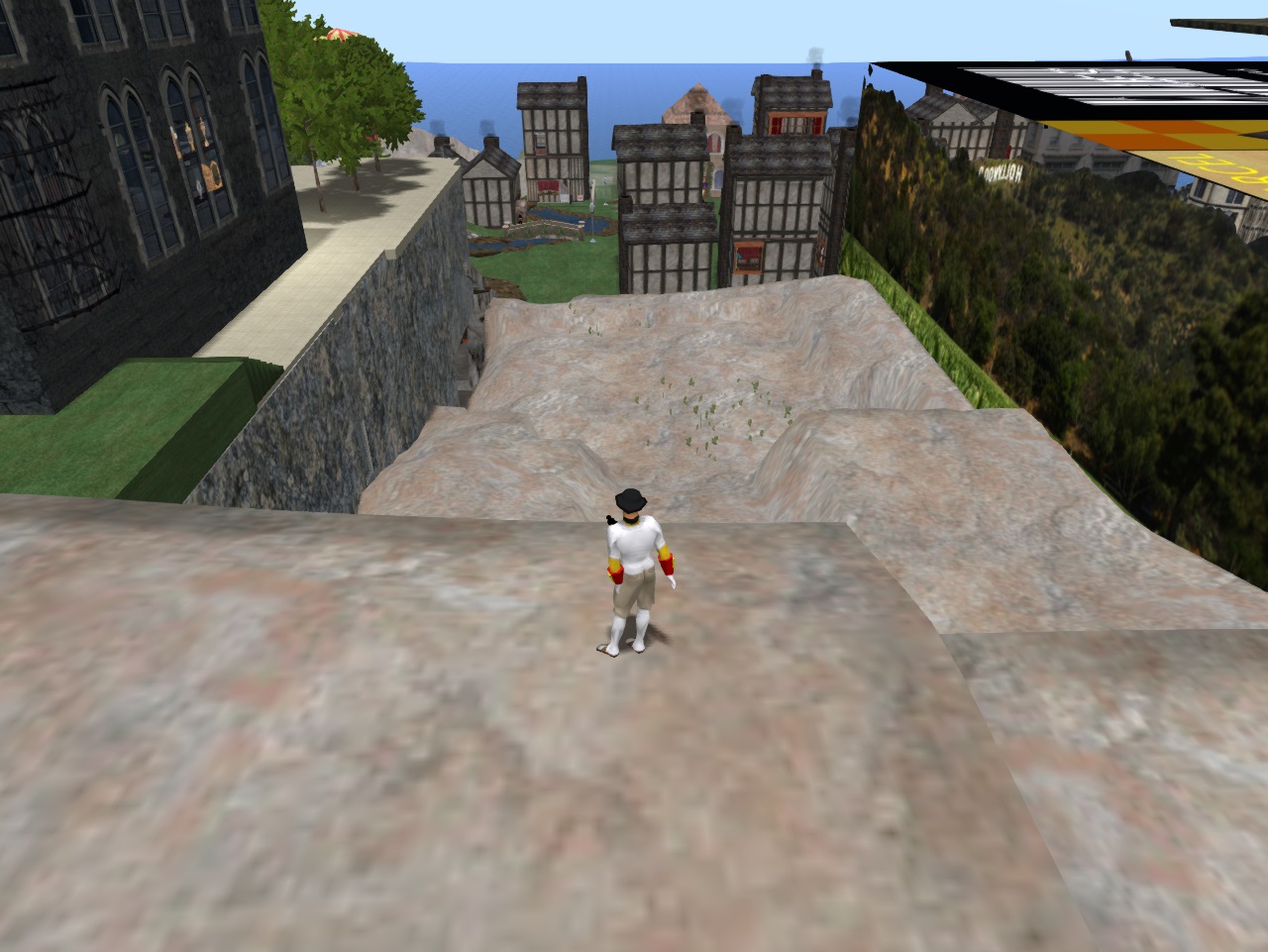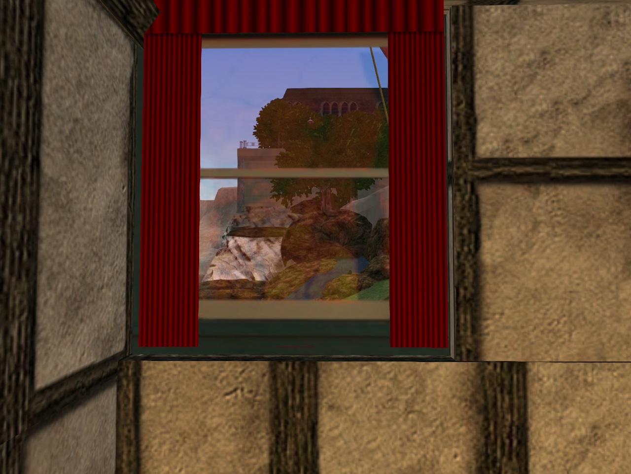 Okay, more curiousities here (!). The sculture is actually positioned right on the line between Mysten to the west and Goremoor to the east. Exactly 1/2 lies in each; this had to be done on purpose. And when Baker Bloch touched the shiny object to see what would happen, he found an object inside called “Diana The Huntress”, another sculpture and one that had existed in Collagesity in both its Noru and Rubi incarnations. He promptly rezzed and positioned it inside Spongeberg’s Magic 12×12, “collaging it in” at a most logical spot: directly behind the ladder leading up to The Snug. All this seems most peculiar. Curiouser and curiouser I might even add.