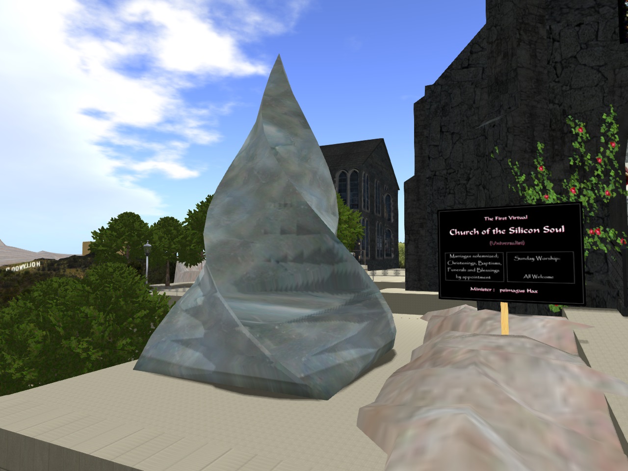 Curious metallic sculpture called “Twisty (Sculpt Prim Example)” at the front of the church. The sculpture lies in Mysten, the church in Goremoor. The statue stands at the lower right corner of the church, as Esme Weatherwax stands at the lower right corner of what appears to be her cottage. Purposeful mirroring?