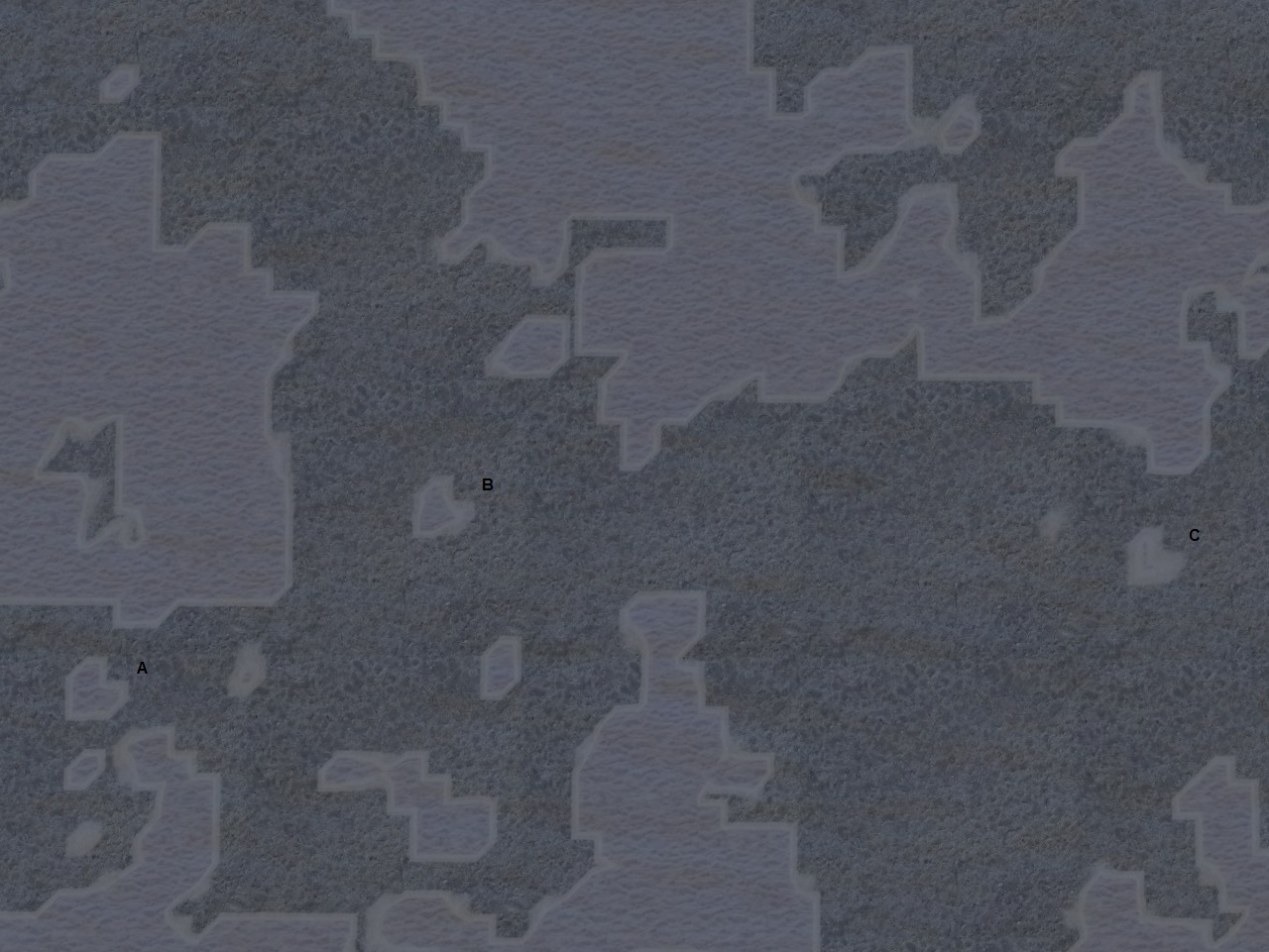 Answer: To the true supercontinent of The Measure glyphs, taking up most of its northern hemisphere. I’ve circled it in red below (low resolution version). Each of the four 8190 square meter regions of this hemisphere contain part of the supercontinent. The basic idea is more condensed brown sea floor masses (“land”) that are connected by isthmuses or necks of the same color. If he wished, Baker Bloch can walk all over this area without having to cross a beige part of the sim; he can remain on brown.